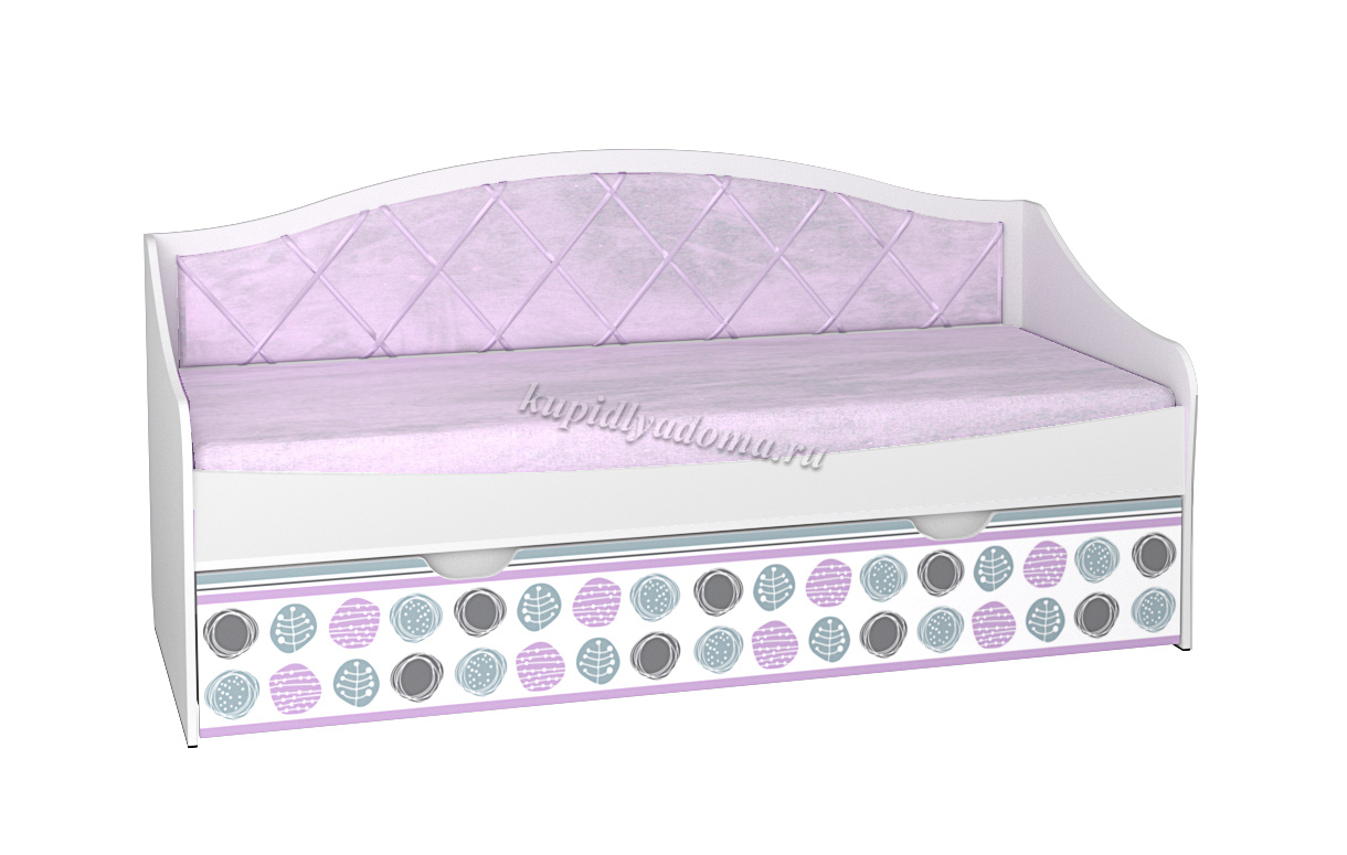 Цвет ЛДСП белое с фотопечатью, спинка мягкая (ткань) цвет лиловый.