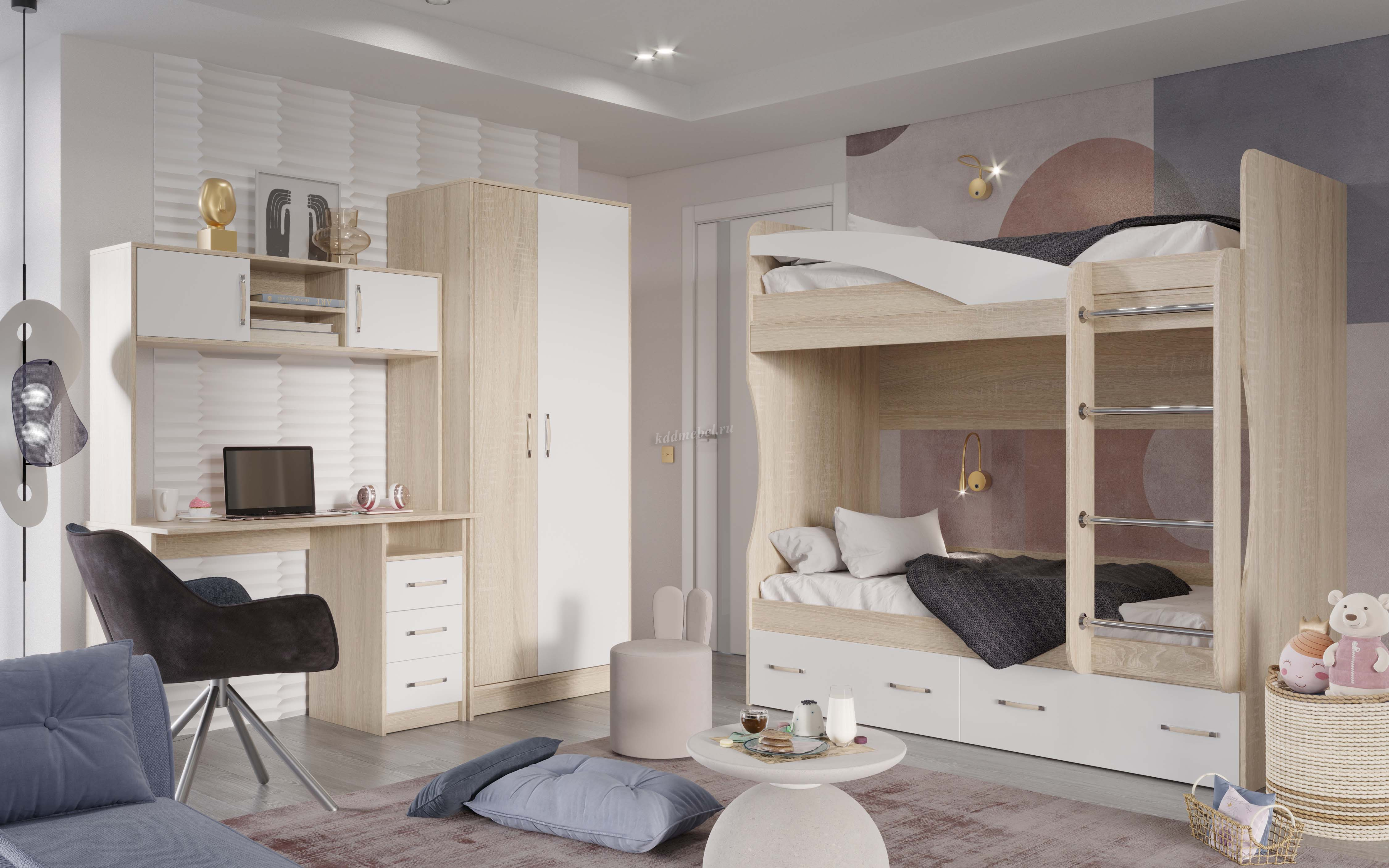 Описание Кровать двухъярусная Буратино (Дуб сонома/Белый)