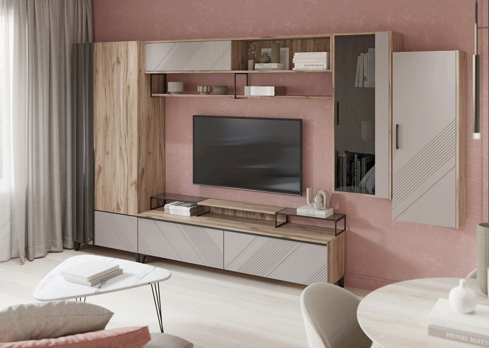 Новая модульная коллекция для гостиной Кенди сочетает в себе последние тенденции мебельного рынка: актуальное сочетание цветов, декорированные геометрическим рисунком фасады, продуманное наполнение и высокое качество каждого модуля.
