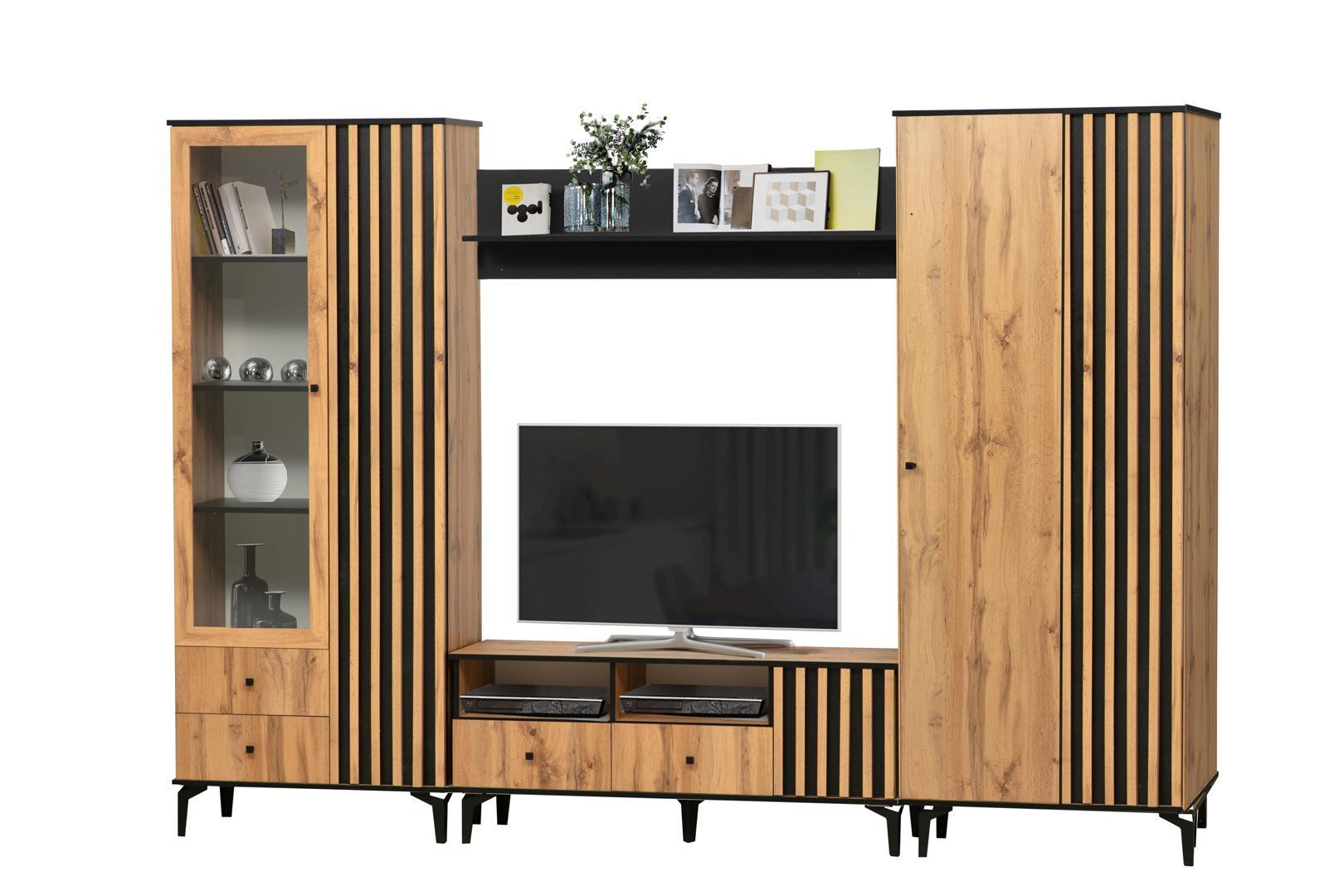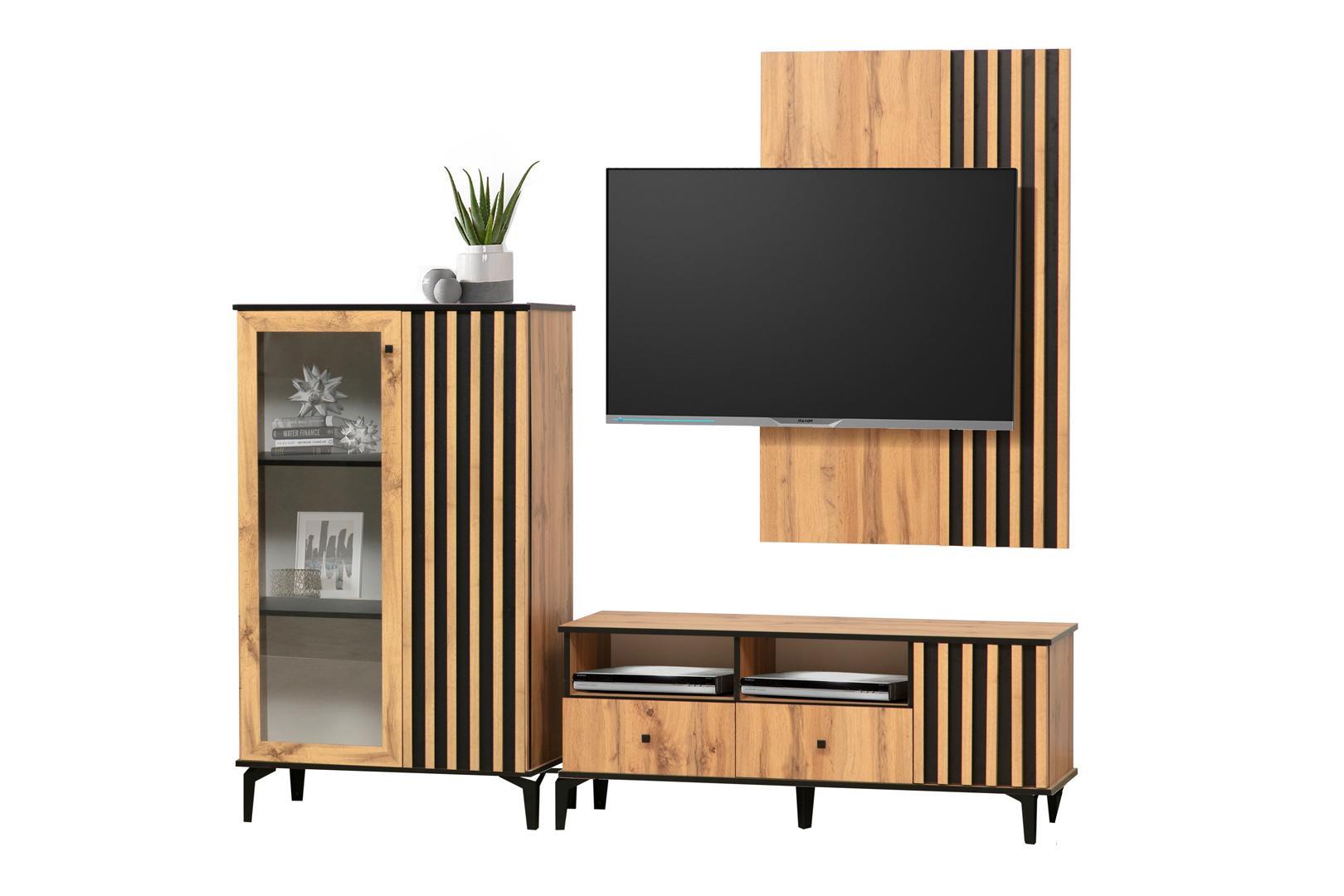 Древесный декор корпуса и фасадов неизменно ассоциируется с теплотой и домашним уютом, при этом чтобы обстановка получилась оригинальной, а не перегруженной, в дизайн модулей добавлен контраст с черными элементами. Черные металлические ручки и опоры позволяют получить красивую комбинацию, подчеркнуть текстуру, расставить акценты.